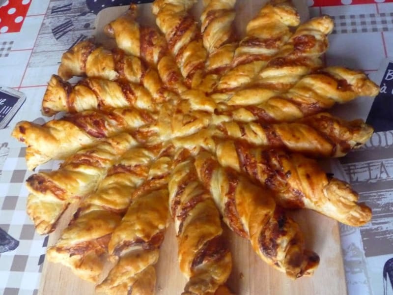 Disposez une feuille de papier sulfurisé sur le plan de travail et étalez une première pâte. Twist each strip three times leaving a centimetre or so from the centre. Française Temps de préparation. Recette de tarte soleil à partager pour lapéro.
